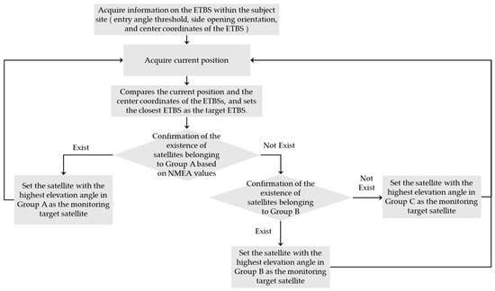 Figure 10 shows the process flow for selecting monitoring target satellite. The receiving device has prior information about the entry angle threshold, side opening orientation, and center coordinates of the TBS as parameters. Assuming that there are multiple TBSs in the target site, the nearest TBS, which is identified by comparing the center coordinates of each TBS from the current position of the receiving device, is determined as the target TBS. The receiving device checks the elevation and azimuth angles of each satellite, which are acquired in NMEA format, to see if any of these satellites belong to Group A. If there is a satellite belonging to Group A, if there is one satellite that belongs to it, that satellite is set as the monitoring target satellite. If more than one satellite belongs to Group A, the satellite with the highest elevation angle is set as the monitoring target satellite. If there are no Group A satellite, the satellite with the highest elevation angle among Group B satellites is set as the monitoring target satellite. If there are multiple satellites in the same group, the satellite with the highest elevation angle shall be set as the monitoring target. If there are no satellite in Group B in the satellite configuration, the satellite with the highest elevation angle among Group C satellites is set as the monitoring target satellite. However, in this case, the detection accuracy of the TBS stay is expected to be low because the monitoring target satellites have low elevation angles.