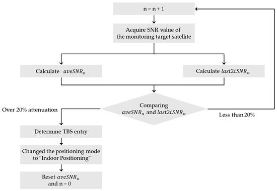 where denotes the rate of the SNR change, denotes the SNR value of the monitoring target satellite for the i-th time, denotes the average of the SNR of the monitoring target satellite for the last two times, denotes the average of the SNR of the monitoring target satellite before the last two times. For example, when starting data acquisition outdoors, is around 0 because the SNR value does not attenuate. When the receiving device enters the TBS, does not change much yet, but the changes significantly due to the attenuation. The value of decreases accordingly. We can find that the change rate is much lower once the receiving device enters TBS compared to when it was walking outdoors. When the threshold for entry detection is set as 20%, we can determine the entry into the TBS by tracking the change in SNR of the monitoring target satellite. Table 2 shows the SNR attenuation rates for the monitoring target satellite at the time of TBS entry for the 36 measurements in the preliminary experiments. The average attenuation is 26.3%, with 20.5% attenuation occurring even at the lowest attenuation. Based on these results, the process flow for detecting entry into the TBS is shown in Figure 12. When is 20% or more attenuated than , we determine that the receiving device has entered the TBS. Then, the positioning mode is changed from outdoor positioning to indoor positioning. By changing the positioning mode, we can calculate the current position using the indoor positioning environment built in the TBS.