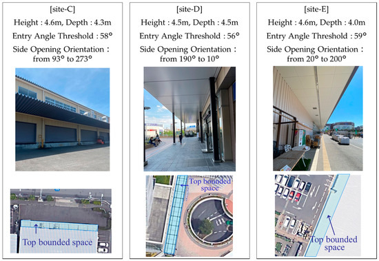 To confirm the effectiveness of the proposed method, we conducted evaluation experiments at three locations that had the same characteristics as those in the preliminary experiments. An overview of the evaluation experiment sites is shown in Figure 13. The measurement device was model A, which was the same as that in the preliminary experiments. The same measurement routes as those in the preliminary experiments was set up for each site in the evaluation experiments, and the tester walked at a speed of about 1 m/s with the smartphone held horizontally in front of their body at a height of 1.2 m above the ground. Then, the SNR, elevation angle, and azimuth angle for each satellite, recorded in NMEA format every second during the walk, were acquired using a smartphone application. For site-C and site-D, the 1 m entry, 2 m entry, and 3 m entry routes into the TBSs were measured three times each, and these measurements were made in the morning and afternoon for each site to consider the change in the satellite configuration with time. For site-E, we measured the 1 m entry and 2 m entry route three times, in the morning and afternoon. We obtained a total of 48 measurements.