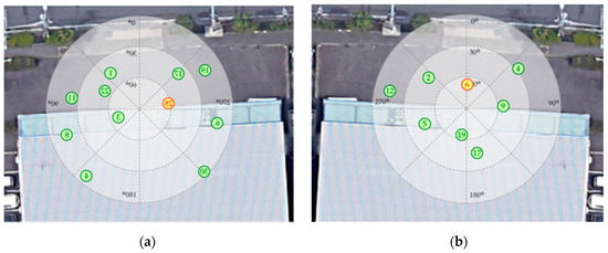 Example of satellite configuration during evaluation experiment at site-C: (a) morning experiment; (b) afternoon experiment.