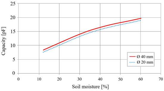 First, the surface of the electrodes must be limited to lower the cost of fabrication. The objective is to reduce the transducer’s diameter while preserving the homothetic dimensions relationship to affect the transducer’s ultimate capacity minimally. For re-dimension, the transducer makes it possible to obtain a 20 mm diameter on electrodes with a width of 30 mm, spaced 8 mm apart. Figure 3 shows the capacities evolution as a function of mass soil moisture for a diameter of 20 mm instead of 40 mm.