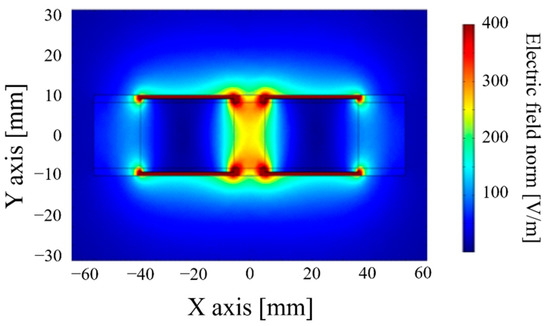 These simulation results show that a cylinder-shaped transducer with adapted electrodes (centered between (−20; 0) and (20; 0)) makes it possible to observe a 50 mm radius with an electric field density higher than 50V/m, which means that the soil volume is approximately 1.32 dm3. A sensitivity of 0.26 pF/% is needed to probe a sufficient volume of soil electronically. Yet, the copper surface needed is relatively significant (15,080 mm2), which raises the sensor’s cost. To optimize the dimensions of the transducer and thereby reduce the surface of the electrodes, Table 1 and Figure 6 present results obtained: