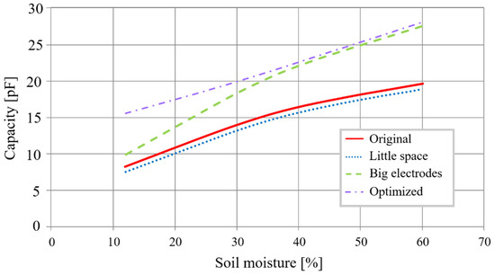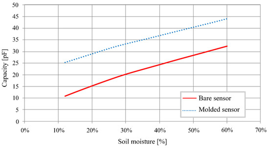 With this new design, we obtain a linear sensitivity and at a lower cost (Figure 8). The sensitivity is now at 0.2656 pF/%, and with a surface of 2670.35 mm2, the soil’s volume probed is about 1.13 dm2.