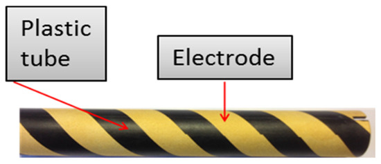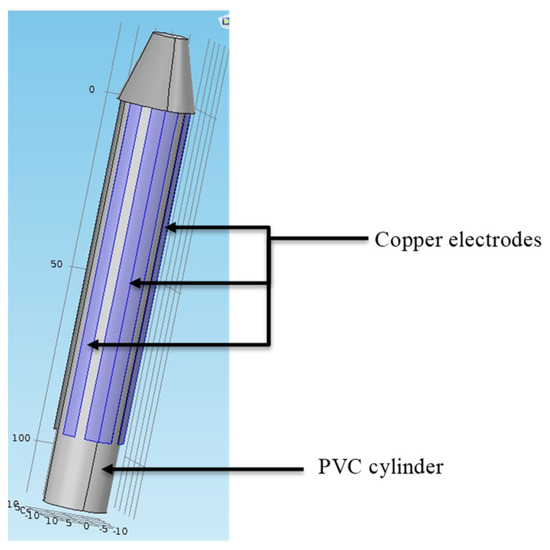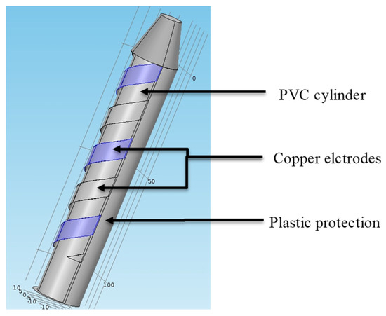 The transducer’s design is based on the same principle as an elementary shape capacitor (Figure 2). The structure rests on two electrodes separated by a dielectric image of the soil. A cylindrical shape is preferred for this type of transducer in order to facilitate insertion into the ground. Copper electrodes are fixed to the cylinder, as shown in Figure 2. Since the thickness of the electrodes is less than 1/10 mm, the inter-electrode Celectrodes capacity is negligible.
