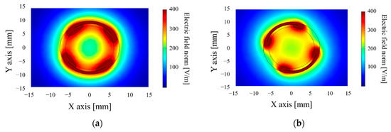 Electric field density around the first design (a) helicoidal sensors and the optimized design (b).