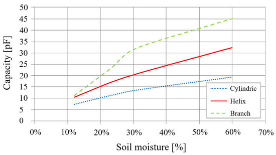 The double helix shape’s sensitivity is 67% higher, with a sensitivity of 0.4417 pF/% compared with the cylindrical sensor’s 0.265 pF/%. Moreover, response linearity is much better. The transducer obtained is, therefore, more sensitive for an equivalent cost. The sensor with branches also improves its sensitivity—by 0.7188 pF/% or 171%. Nevertheless, the response obtained is not linear throughout the entire measurement. The graphic (Figure 14) shows two linear zones before and after 27% moisture in the soil. The electronic treatment will consequently require two reading equations.