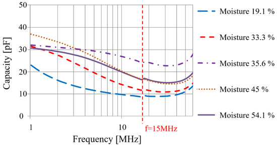 Given the sensor’s macroscopic capacitive behavior as a function of moisture in the soil, this analysis (Figure 15) is necessary to identify the useful measurement frequency ranges.