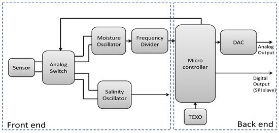 The back end, or the second part of the architecture, delivers readings of the variations. The back end is structured around one microcontroller embedded with a frequency meter algorithm dedicated to double measurement of a frequency. The microcontroller is equipped with a TCXO-type precision clock to minimize the temperature effect of the measure. This microcontroller’s frequency performance is voluntarily limited to reduce the system’s cost, this explains why the frequency is divided. Once this electronic treatment is accomplished, the back end proposes two complementary outlets, an analog outlet that delivers voltage proportional to moisture or salinity with an ADC aid, and a digital outlet that can be configured to establish a communication link with a standardized protocol (slave SPI). We have decided to implement two outputs, one analogic and another digital. This gives the choice to use another microcontroller to recover and process the digital output or implement an analogic instrumentation chain.