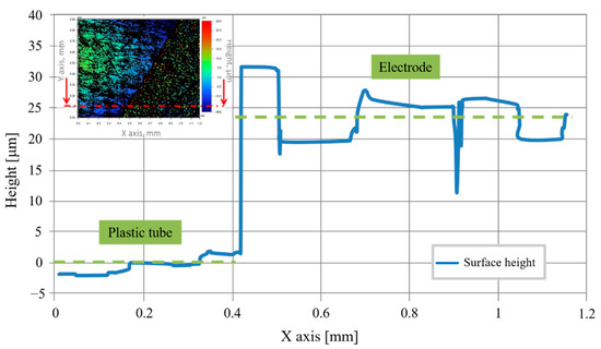 The electrode’s electrical conductivity is ensured by controlling the metallic deposit thickness measured by an optical profilometer (Figure 27). The sensor’s metallic thickness layer presents a value of about 25 µm.