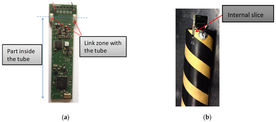 Since the sensor is inserted in the soil, it needs to be mechanically solid so that it is not damaged during installation. The electronic board (Figure 28a) is inserted in the sensor tube to form a compact unit with no flexion points. To promote the ensemble’s mechanical longevity, the recesses (Figure 28b) have been specifically sized.