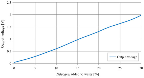 Then, Figure 32 shows the sensor output voltage responding to the salinity variations. To obtain these variations, soil samples are moistened to the same humidity, and nitrogen and common fertilizer are dissolved to modify soil salinity. These measurements present a variance of 0.56 V/%, a standard deviation of 0.31 V/%, and linearity of 98.27%.