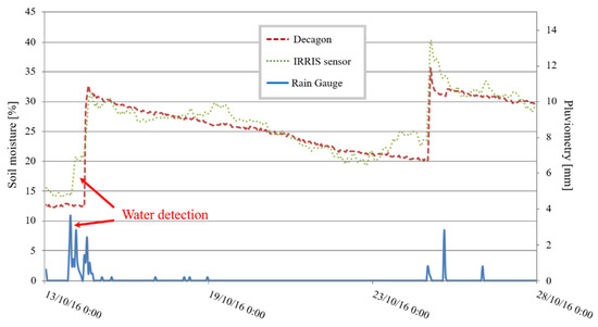 The higher sensitivity of the IRRIS sensor is noticeable; the moisture measurement increases as soon as water is detected by the IRRIS sensor. In contrast, the Decagon sensor does not detect this water presence until after a few hours (red arrows). Detection, therefore, is better with the IRRIS sensor. The rising dynamic (+20%) and the descending dynamic (−2% per day) are identical for the two sensors, validating the sensor’s good performance on this piece of agricultural land.