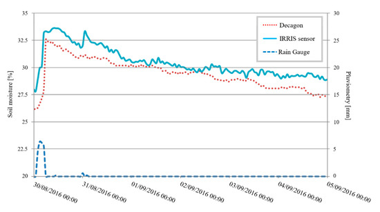 This figure compares the dynamic and the response time of the IRRIS sensor compared with the Decagon sensor. In terms of reactivity, the IRRIS sensor reacts 30 min before the Decagon’s. As regards dynamics, the moisture measurement rises due to the identical water supply for both sensors (+7%). The descent dynamic is more rapid for the Decagon since it has been placed closer to the plants, and water is therefore more rapidly absorbed by the plants. These measurement readings testify to the good performance of the IRRIS sensor on this type of crop.