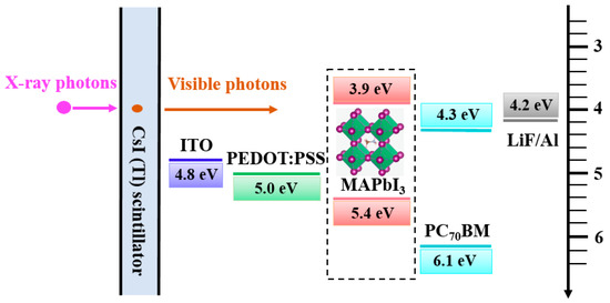 Figure 1 shows the energy-band diagram of the proposed detector with the MAPbI3 active layer. The visible photons converted by the scintillator were absorbed by the MAPbI3 to create electron-hole pairs that were separated in the active layer according to the energy band position. The electrons were transferred to the indium-tin oxide (ITO) anode, where the resulting in charge was collected. As the electron transport layer (ETL), (6,6)-phenyl-C71-butyric acid methyl ester (PCBM) was used, while poly(3,4-ethylenedioxythiophene) polystyrene sulfonate (PEDOT:PSS) was used as the hole transport layer (HTL), which helped the movement of the electrons and holes to the electrodes, respectively.