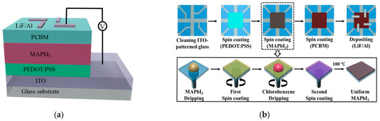 Figure 3a shows a schematic diagram of the fabricated detector, which consisted of glass/ITO/PEDOT:PSS/MAPbI3 perovskite active layer/PCBM/LiF/Al. Figure 3b shows the fabrication procedure of the proposed detector with the perovskite active layer and the solution process to form the layer. An indium-tin-oxide (ITO) anode (150 nm) on a glass substrate was patterned and then cleaned sequentially for 5 min using sonification treatment of acetone, methanol and IPA. The glass substrate was dried in a vacuum oven at 100 °C for 10 min. A charge transport layer of poly(3,4-ethylene dioxythiophene):poly (styrene sulfonate) (PEDOT:PSS, Clevios P VP Al4083) layer was spin-coated on the cleaned glass substrate at 3000 rpm for 30 s, and then annealed at 150 °C for 30 min. The thickness of the PEDOT:PSS layer as the hole transport layer (HTL) was about 30 nm. The prepared MAPbI3 solution was spin-coated on the PEDOT:PSS layer at various spin-rates of 3000, 3500, 4000, and 4500 rpm for 40 s. Before the end of the spin-coating process, 200 μL chlorobenzene solvent was pipetted onto the substrate to wash off the DMSO solvent of the perovskite wet film and induce rapid crystallization. After the spin-coating process, the perovskite film was baked at 100 °C for 10 min. Then, 20 mg of phenyl-C71-butyric acid methyl ester (PCBM, Emindex 609771-63-3) powder was dissolved in 1 mL of chlorobenzene and stirred at 60 °C for 3 h. The PCBM solution was spin-coated onto the perovskite layer at a spin rate of 1100 rpm, and the perovskite was baked at 100 °C for 10 min. The thickness of the PCBM layer as the electron transport layer (ETL) was about 80 nm. After forming the PCBM layer, the aging time of the sample was 12 h. LiF/Al as the cathode, consisting of 5 nm thick LiF and 120 nm thick Al, was deposited on the PCBM layer in a thermal evaporation chamber. The manufactured detector was encapsulated with a glass cover to prevent it from being exposed to air. Finally, the detector with four effective areas of 0.04 mm2 was successfully fabricated.