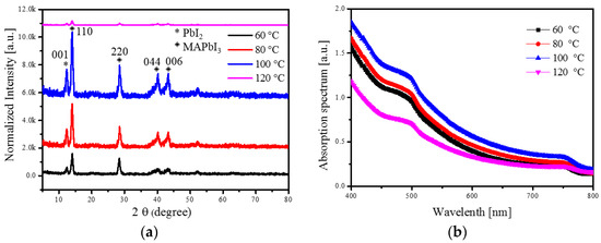 We used X-ray diffraction (XRD) measurements to investigate the properties of the 192 nm thick MAPbI3 layer under different annealing temperatures (60, 80, 100 and 120 °C), as shown in Figure 5a. Noticeable diffraction peaks were observed depending on the annealing temperature. The XRD patterns were composed of two phases, i.e., MAPbI3 and PbI2. For the PbI2 phase, we assigned the peak at 12.21° to the (001) plane. For the MAPbI3 phase, the peaks at 14.08, 28.46, 40.21 and 43.31° were respectively assigned to the (110), (220), (044) and (006) planes. The highest peak intensity of the perovskite layer was achieved at 100 °C. As the annealing temperature of the perovskite increased, the rate of perovskite crystallization was similarly increased, and the crystallinity improved up to the optimal temperature of 100 °C. However, when the annealing temperature exceeded the optimal temperature, i.e., up to 120 °C, the crystallinity dropped significantly, because the MAPbI3 was decomposed into PbI2, CH3NH2 and HI at an annealing temperature of 120 °C [26].