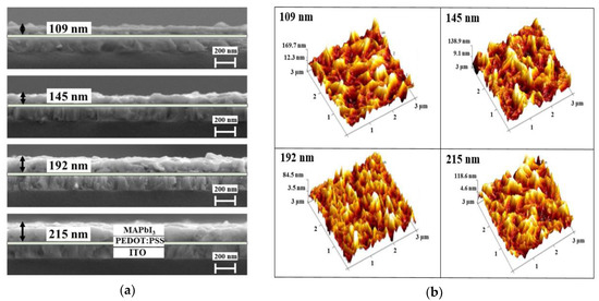 Scanning electron microscopy (SEM) images of MAPbI3 films of different thicknesses grown on a glass/ITO/PEDOT: PSS stacked structure are shown in Figure 6a. The annealing temperature was fixed at 100 °C. The MAPbI3 film thickness depended on the spin-coating speed. From the cross-sectional SEM images, we confirmed that MAPbI3 films that were 109, 145, 192, or 215 nm thick were sequentially formed under spin rates of 3000, 3500, 4000, and 4500 rpm. To understand the effect of perovskite film thickness on the morphology, we used AFM analysis to evaluate the change in the topology of the perovskite films on the ITO-coated glass. Figure 6b shows the topographical 3D images of the perovskite thin films. The RMS surface roughness (Rq) of 109 nm, 145 nm, 192 nm, and 215 nm thick perovskite layers was 43.8 nm, 32.2 nm, 21.9 nm, and 36.8 nm, respectively. As the thickness of the perovskite film increased, the surface roughness decreased. This was because the presolution of MAPbI3 could grow more completely into a thin film. When the thickness increased to 215 nm, the surface roughness increased; this was because some of the presolution could not react completely with an excessively thick MAPbI3 layer.