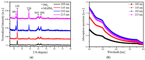 (a) XRD patterns and (b) absorption spectra of MAPbI3 layer with different thicknesses at an annealing temperature 100 °C.