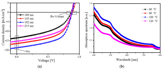 Good absorption properties in the visible region of the active layer are important. To further understand the light absorption capacity of perovskite layers, we measured the absorption spectra of MAPbI3 layers with different thicknesses annealed at 100 °C. Figure 7b shows the absorbance curves of the perovskite layers. The absorbance of the perovskite film increased with increasing thickness. The highest absorbance was obtained with a 192 nm thick perovskite layer. When the thickness of the perovskite film exceeded 192 nm, the previous AFM and XRD measurements showed an increase in surface roughness and a decrease in crystallinity.