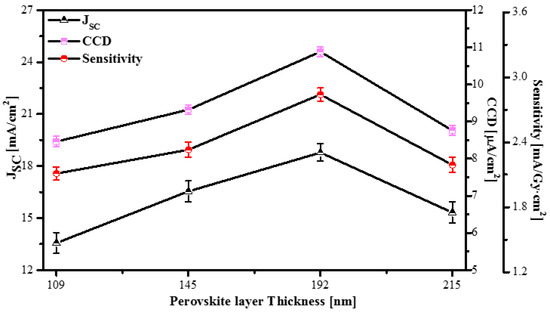 JSC, CCD, and sensitivity of the detector based on MAPbI3 layer with different thicknesses at an annealing temperature 100 °C. Error bars represent the standard deviation based on 10 devices per condition.