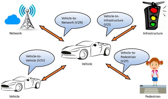 The number of autonomous vehicles on the road has been increasing rapidly over the past few years. It is imperative that the implementation of a reliable V2X communication system is created to ensure reliable and autonomous operation. Moreover, it is an integral part of the future smart cities and self-driving cars [1,2]. V2X is the communication of a vehicle to any unit, such as other vehicles or roadside infrastructures [3]. V2X communication has four main constituents including vehicle to vehicle (V2V), vehicle to infrastructures (V2I), vehicle to pedestrian (V2P), and vehicle to network (V2N) communication as presented in Figure 1. V2V is the communication among vehicles on the road, intending to avoid collisions, reduce travel time, and autonomous driving [4]. V2I communication is the exchange of data among the vehicles and road infrastructures for different applications such as collision avoidance, traffic signal control, congestion avoidance, and many more [5]. V2P is to ensure the detection of pedestrians and avoiding accidents. The underlying wireless technologies of smartphones can play a great role in setting up V2P communication. The communication among the vehicles to one or more networks, servers, or data centers is termed as V2N communication and it is one of the least explored parts of V2X communication [6].