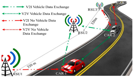 The proposed V2X communication architecture is presented in Figure 2. The green links denote the exchange of vehicle data whereas the red links denote that vehicles or RSUs are within the transmission range of each other but do not exchange the vehicle data according to the defined algorithms 1 & 2. While going through a road, the OBU in the car communicates with RSUs in its vicinity. CAR1 finds RSU1 and RSU2 within its transmission range whereas CAR2 finds RSU2 and RSU3 within its range. Depending on the higher RSSI value from the RSUs, CAR1 starts sending sensor data to the RSU2 and maintain sending the data to it until it reaches the threshold value of −60 dBm. At the same time, it looks for any other vehicle within its radius of 40 m. CAR1 finds CAR2 and vice-versa within the designated range and sends vehicle data to each other. Though RSU1 is within the transmission range of CAR1, it keeps sending data to the only RSU2 to reduce the data overheads. Similarly, CAR2 sends data to RSU2 only following the V2I algorithm even after having RSU3 in the transmission range. Moreover, CAR2 does not send sensor data to CAR3 as it is out of the designated perimeter.