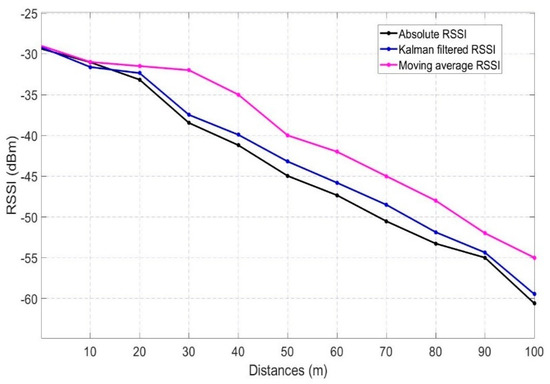 The Kalman filter is computationally heavier in comparison to calculating the raw RSSI value. Few researchers have also used a moving average filter for stabilizing the RSSI values. A performance test has been carried out for finding the accuracy and stabilizing capability of the Kalman filter and moving average filter in comparison to the absolute RSSI values as in Figure 3. The average of 50 RSSI values taken at static state has been taken as the absolute RSSI value whereas the moving average filter takes 5 RSSI readings at a time for stabilizing any outlier fluctuation. The test has been carried out in a 100 m space at a speed of 5–10 kmph taking the reading in every 10 m of interval. Figure 2 shows the comparison of the moving average and Kalman filtered values with respect to the absolute values (Mean of 50 values). The results show that the Kalman filtered values get much closer to the absolute values in comparison to the moving average filter thus it stabilizes more perfectly. This is because the RSSI values change very fast for any mobile object and the moving average filter always calculates the dynamic average of any given number of points. So, with moving average filter RSSI values get update slowly and move away from the absolute value. On the contrary, the Kalman filter adapts to this dynamic environment more precisely with the prediction and update step. Thus, the Kalman filter is adopted in the proposed algorithms for better stabilization of RSSI values which is one of the factors for ensuring better reliability.