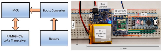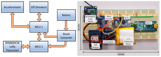 Two main components of the proposed architecture are OBU and RSU. As OBUs are integrated into vehicles to collect and send vehicle data to other vehicles and infrastructures, they are equipped with sensors and transceivers. To make it computationally efficient, and maintain low power consumption, OBU is comprised of two micro-controller units (MCUs). One MCU processes and parses the sensor data and communicates serially to transfer the data to the second MCU that remains connected to the LoRa transceiver RFM69HCW module. Arduino pro mini and Arduino nano boards are used as MCU1 and MCU2 respectively and both the boards use the same ATMega328p microcontroller chip which has the static random-access memory (SRAM) of only 2 KB and a clock speed of 16 MHz ADXL345, a digital 3 axis accelerometer, and an MTK3339 chipset-based GPS module are integrated to the MCU1 with inter-integrated circuit (I2C) serial bus and software serial respectively. MCU1 gets the data from the sensors and parses them to prepare the required payload. X, Y, Z-axis acceleration data along with latitude and longitude data are sent to MCU2 with serial communication. MCU2 is integrated with the RFM69HCW transceiver module with the serial peripheral interface (SPI) bus. A TPS61090-based boost converter is used both in OBU and RSU to supply 5 V from a very compact 3.7 V Lithium-Ion battery. RSUs are much simpler in construction in comparison to OBUs. RSUs have only one MCU unit integrated with the same RFM69HCW LoRa module with the SPI bus. Figure 4 and Figure 5 show the prototypes of the OBU and RSU, respectively. MCU1 sends the collected data to MCU2 with serial communication and MCU2 being integrated with the LoRa transceiver transmits the data to other OBUs and RSUs.