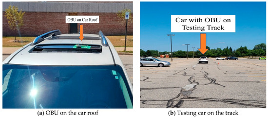 Outdoor testing of the prototypes is conducted with actual cars on the road, by integrating the OBU at the car roof and connecting RSUs with computers for data analysis. Figure 8 presents the part of the testing set up with OBU on the car roof and testing the car on the track.