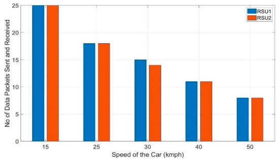 Moreover, there will be no data generation time as the OBU is sending only the ‘Hello’ message to OBU which means the OBU is no needed to collect and parse the data from the sensors to send each packet data. It reduces the burden on the processing unit and sends each data packet with an interval of only (1.67 s). According to Algorithm 1, when a car goes along the road it should communicate with the RSU depending on the best link quality and should switch from that RSU to another when the link quality degrades and reaches a defined threshold value. Thus, if two RSUs are placed at an equal interval and a vehicle with OBU goes along the road, the RSUs should receive an equal number of data packets.