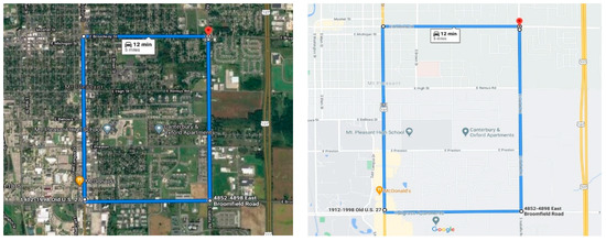 One of the important challenges of the proposed architecture is the handoff from one RSU to another in V2I. To evaluate the handoff, the architecture is tested with multiple RSUs in a university environment. As the earlier tests suggest, RFM69HCW can communicate consistently up to 160 m in a mobile environment with regular traffic on the road. Distances between two consecutive RSUs are maintained to 320 m allowing each RSU to have a radius of 160 m. Two RSUs are placed at a distance of 320 m from each other as in Figure 9. The architecture is primarily tested with simple ‘Hello’ message, thus the data packet is consisting of only 16 bytes in comparison to generated vehicle data of 40 bytes.