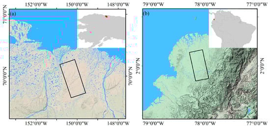 The coverage and map projection of PALSAR images to be presented in our study for ionospheric phase compensation at (a) Alaska and (b) Equator.