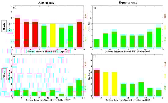 (a,c) the global geomagnetic activity index Kp corresponds to the Alaska case, (b,d) the index Kp corresponds to the Equator case. The red, yellow and green squares indicate different levels of geomagnetic activities.