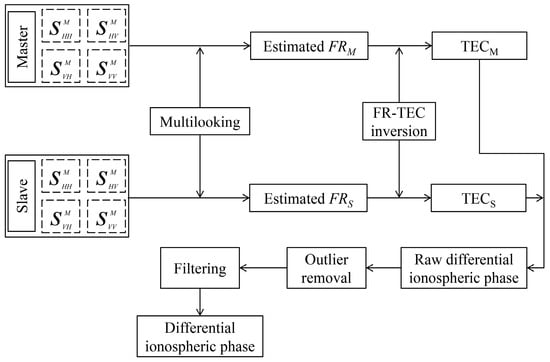 As shown in Figure 3, the process flow of our proposed approach is summarized. First, the calibration should be carefully performed for the qualitative use of SAR data. Then, construct the polarization coherence matrix according to the calibrated polarization scattering matrix, followed by a multi-looking procedure for noise reduction. After that, the FR estimates (FRM, FRS) of master and slave images are computed according to Equation (4), respectively.