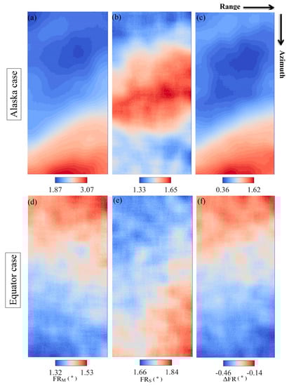 FR estimation is a key step in the process of the FR inversion. Before the calculation, the SAR images are processed by a multi-looking operation of 7 pixels in the azimuth and 1 pixel in the range directions to reduce speckle noise. Utilizing the elements in the polarization coherence matrix, the FR values can be calculated by Equation (4), and followed by a 2-D Gaussian weighted filter with a window size of 128 on the FR images. Estimated FR for the master and slave images and the differential FR images are presented in Figure 4.