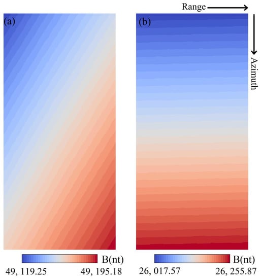 The intensity of the Earth’s magnetic field is also an essential element for calculating the ionosphere phase. In our study, considering the small inter-annual variation of the magnetic field, the magnetic field strength at the master image acquisition was selected as the input parameter. The geomagnetic field was collected from geomagnetic data provided by the National Geophysical Data Center (https://www.ngdc.noaa.gov/). To improve the computational efficiency, calculations were first generated at 0.1° increments in latitude and longitude covering the experimental area, followed by Kriging interpolation and coordinate conversion. After this operation, the magnetic field images were obtained in the SAR geometry (Figure 5).