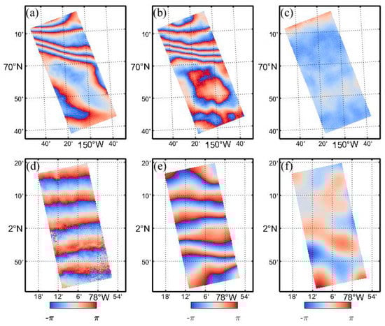 As shown in Figure 6, fringe patterns of the ionospheric phase are consistent with the differential interferograms. The ionospheric phase in the Alaska case distributes irregularly: The upper half of the image fluctuates more rapidly than the lower part, while in the equatorial case, the fringes are regularly arranged along the azimuth direction, which can be easily mistaken as orbit errors if not carefully identified. Since the ionospheric correction cannot compensate for the longwave signal related to orbit error, a separate baseline fitting is still necessary after the initial ionospheric correction step. According to Equation (8), the topographic phase, ionospheric phase, and baseline error-corrected interferograms are generated and displayed in Figure 6c,f.