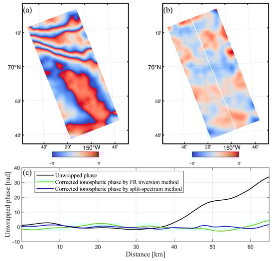 Ionosphere phase compensation of the Alaska case derived from the split-spectrum method: (a) The estimated ionospheric phase screen, and (b) ionosphere-compensated interferogram, (c) phase comparison with and without ionosphere correction along the profile in white line.