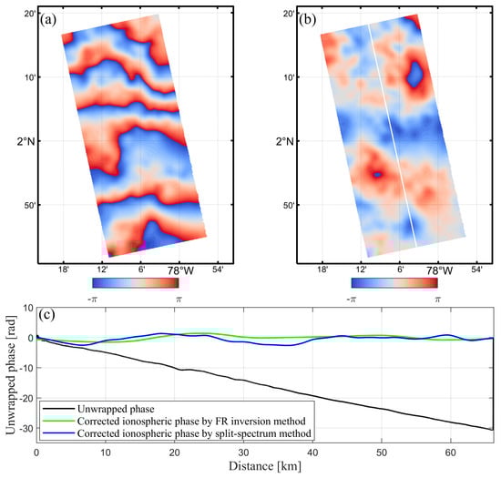 Ionosphere phase compensation of the Equator case derived from the split-spectrum method: (a) The estimated ionospheric phase screen, and (b) ionosphere-compensated interferogram, (c) phase comparison with and without ionosphere correction along the profile in white line.