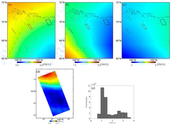 Total electron content (TEC) comparison in the Alaska case: (a,b) TEC maps derived from the GIM model for master and slave acquisition, respectively. The black line and square represent the orbit and image ground footprint; the red square indicates the crossed region projected to the ionosphere; (c,d) differential TEC obtained by the GIM model and FR inversion, respectively. (e) The histogram of (d).