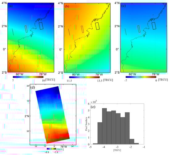 TEC Comparison in the Equator case: (a,b) TEC maps derived from the GIM model for master and slave acquisition, respectively. The black line and square denote the orbit and image ground footprint; The red square indicates the crossed region projected to the ionosphere; (c,d) differential TEC obtained by the GIM model and FR inversion, respectively. (e) The histogram of (d).