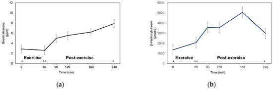 Another interesting finding is that BOHB and ACAC started to decrease after 2 h of exercise recovery, while BrAce continued to increase up to 3 h of recovery after exercise. This result could be explained by the fact that BrAce and BOHB differentiate not only to changes in ACAC production rate but also to relative changes of ACAC conversion into BrAce and BOHB [44]. Another natural explanation for this phenomenon could be the necessary time delay for BrAce to reflect blood ketone levels. However, a clear understanding of this phenomenon is beyond the scope of our study.