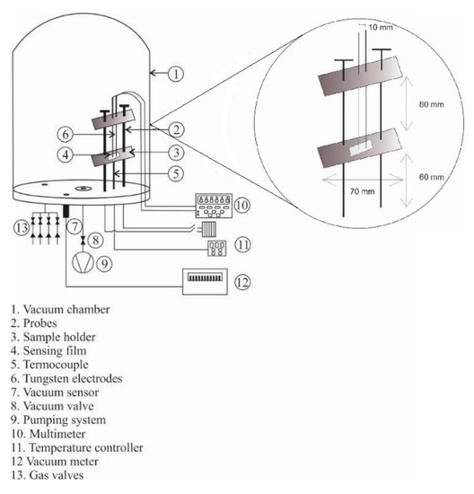 To achieve a uniform gas pressure throughout the chamber (since it is large, 10 liters), sometime is allowed to pass after the desired pressure is achieved (15 min) and thus a good gas distribution is achieved inside the chamber. The sensing response was measured from 100 to 300 °C, which was achieved by the usage of a cromel–alumel thermocouple, 2-prong configuration. Schematic diagram of the characterization system used for measurements shown in Figure 2.