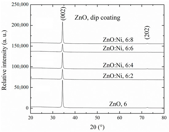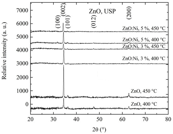 Figure 3 shows the X-ray diffraction spectra of ZnO films obtained by dip coating. All the measured peaks coincide with that of JCPDS card no. 36–1451 for wurtzite type ZnO structure [61]. In Figure 3 the diffraction spectra for the ZnO films deposited by dip coating are shown. Some spectra, corresponding to the ZnO:Ni, 6:6, Figure 3 or ZnO:Ni, 3%, 450 °C, Figure 4 films, show less intensity in the (002) preferential plane in comparison to the other spectra, due to the grain growth along diverse directions, thus affecting the crystalline quality, and hence less reflection of (002) planes. The X-ray spectra for ZnO films deposited by USP are shown in Figure 4, which contains similar preferential orientation (002) as the ones deposited by dip coating. However, the diffraction peaks of the USP deposited films are less intense and more numerous due to less crystalline. A much-detailed analysis of these two spectrums are presented as follows.
