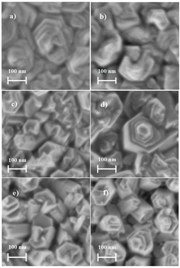SEM images of the undoped and doped ZnO films deposited by USP are shown in Figure 6a–f. The films present a similar aspect, that is, grains tend to form non-definite geometric structures, possibly resembling tripods, pyramids, hexagonal and rose-petals, the grain size of which varies from 90 to 250 nm as shown in Figure 6a–f, although the large grains may be due to the result of the agglomeration of smaller grains, as reported by A. Smith et al [72].