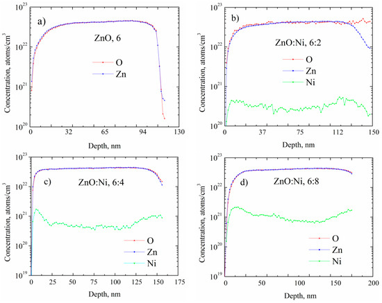 SIMS depth profiles for ZnO films doped with (a) 0, (b) 2, (c) 4 and (d) 8 dippings in Ni solutions.