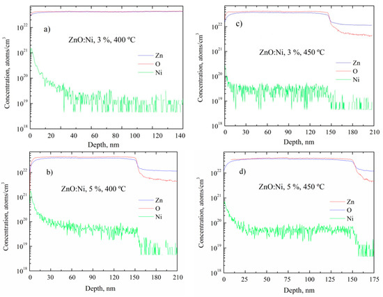 SIMS depth profiles for ZnO films doped with 3 at. %, at (a) 400 °C and (b) 450 °C and for ZnO films doped with 5 at. %, at (c) 400 °C, and (d) 450 °C.