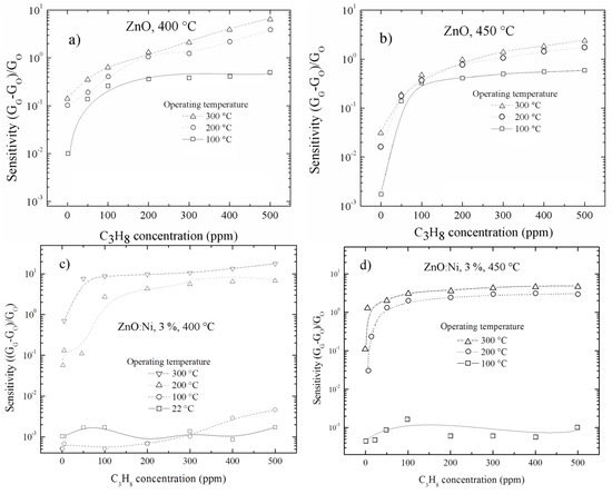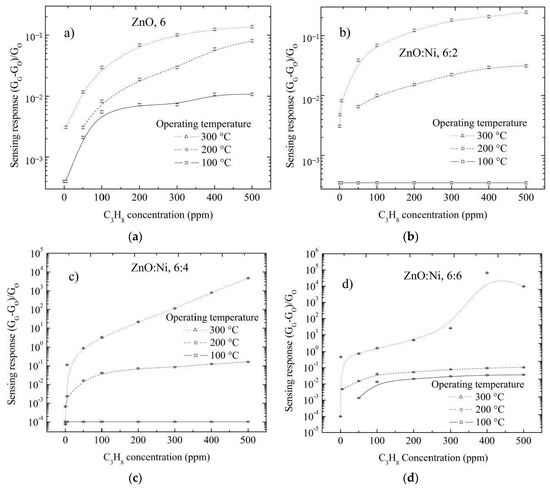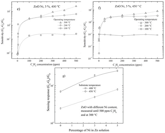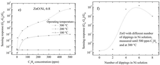 Maximum gas sensing response was obtained for Ni doped ZnO films doped with 6 dippings, as is shown in Figure 9d; further increase in the number of dippings did not cause any significant change in surface electrical resistance according to Figure 9e. This can be attributed to the fact that ZnO surface was saturated with Ni atoms in the form of agglomerates, which subsequently prevents additional adsorption of oxygen. Maximum sensing responses were registered at 500 ppm of C3H8, and measured at 300 °C as depicted in Figure 9f.