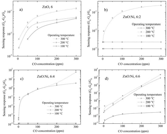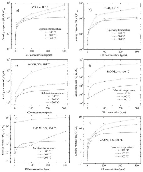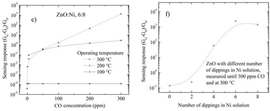 The results of sensing responses for undoped ZnO and doped ZnO films deposited by UPS and in an environment of CO are present in Figure 13a–f. In the same case, the sensing responses of ZnO films deposited by dip coating in a CO environment were smaller compared to ZnO films in a C3H8 environment. The heath that the heather radiates causes the C3H8 molecules to become fragmented, causing a higher possibility of reaction of the C3H8 molecules with the ZnO surface; hence, in general, the sensing responses are higher in a propane environment than in carbon monoxide. Furthermore, the sensing responses decrease as the number of dippings in Ni solution increases, from the eighth dipping for the ZnO films deposited by dip coating in both a C3H8 and CO environment (Figure 9 and Figure 10); however, the sensing response increases as the Ni in Zn solution increases for the ZnO films deposited by UPS in both a C3H8 and CO environment (Figure 12 and Figure 13). In the next section, we analyze the sensing responses in the function of the Ni concentration in crystal lattice.