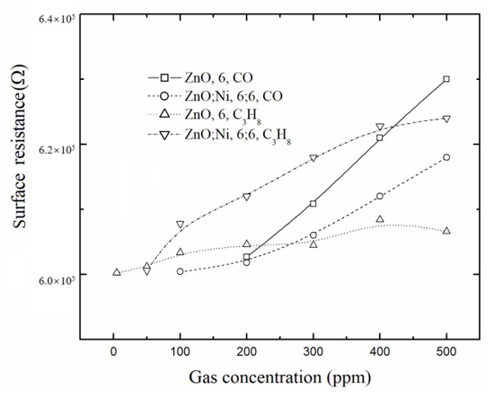 In Figure 11, the surface electrical resistance values are presented as a function of the gas concentration for the ZnO films deposited by dip coating and measured at 100 °C and at different gas concentrations, in which it can be observed that even at low temperature, there is a change in the surface electrical resistance.